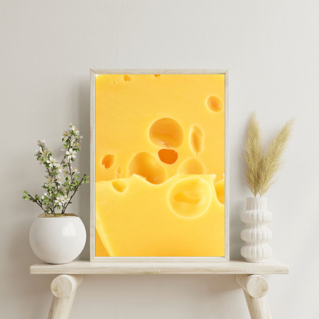 Cuadro de comida ideal para cualquier amante del queso para darle un toque de mucho color a cualquier espacio, perfecto para la decoración del hogar u oficina.