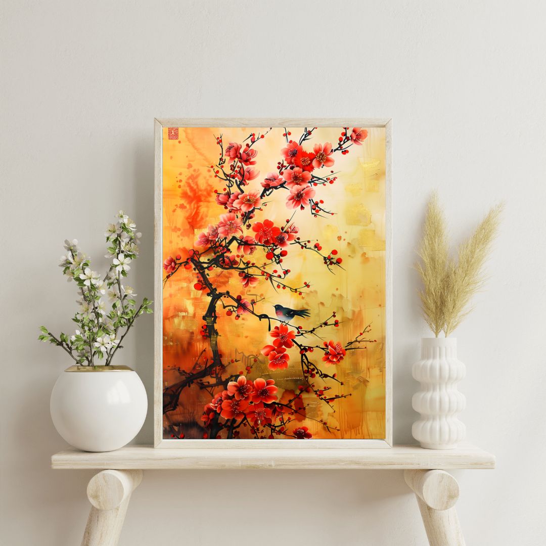 Cuadro floral con un árbol con flores rojas y un hermoso pájaro justo en la mitad del cuadro, perfecto para la decoración del hogar u oficina.