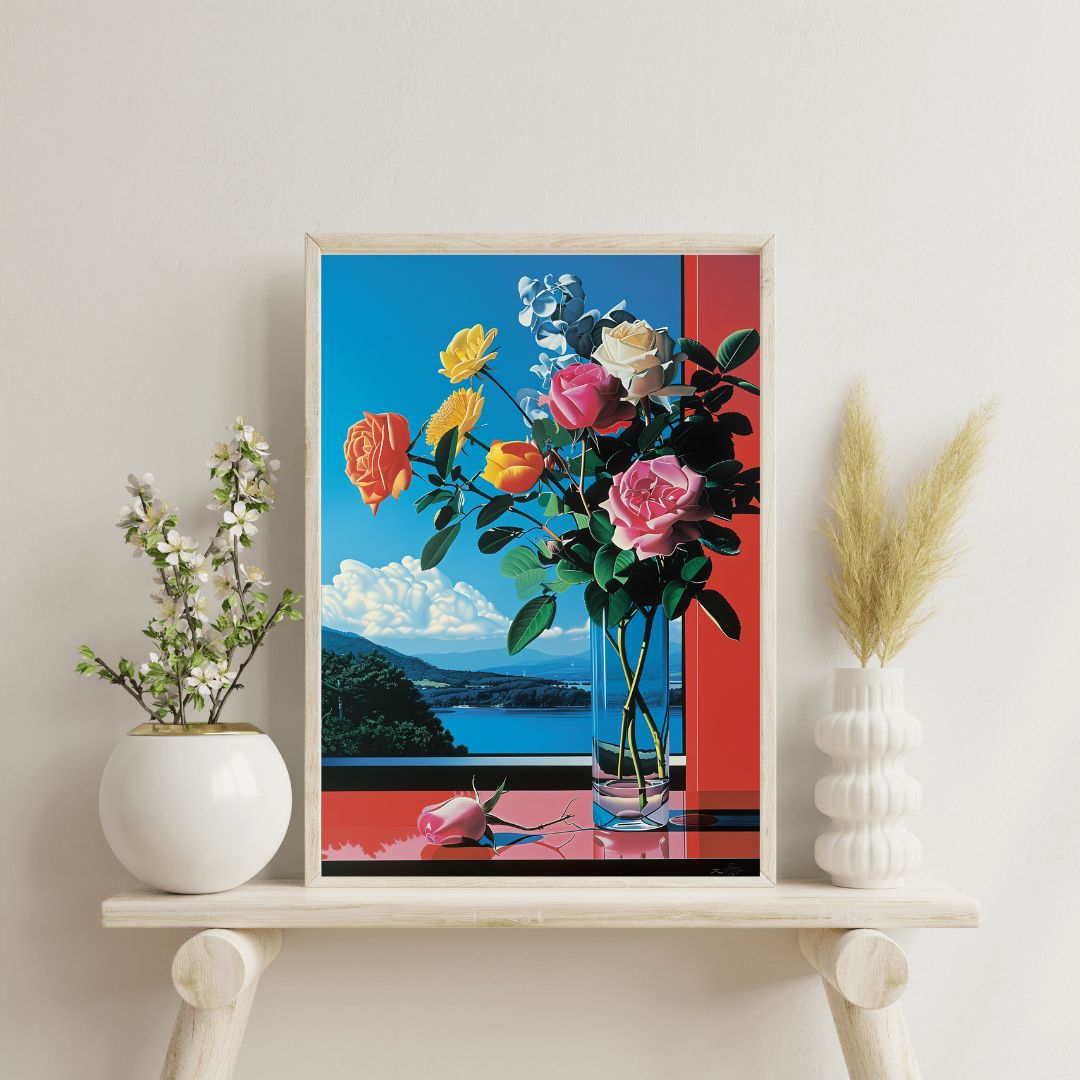 Cuadro floral con unas rosas en primer plano y un hermoso paisaje en el fondo, perfecto para la decoración del hogar u oficina.