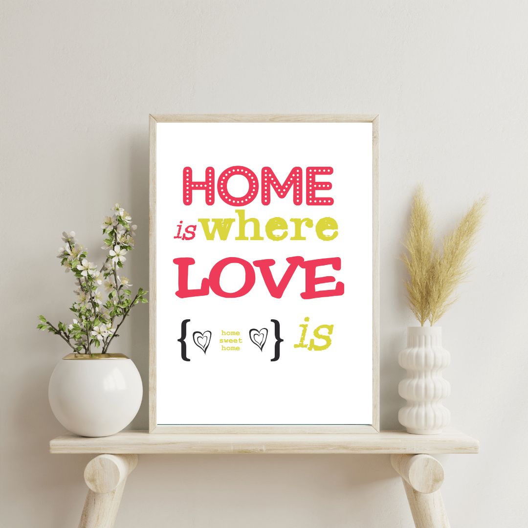 Cuadro de frases que te inspira a buscar el amor con la frase de el hogar es donde está el amor, perfecto para la decoración del hogar u oficina.