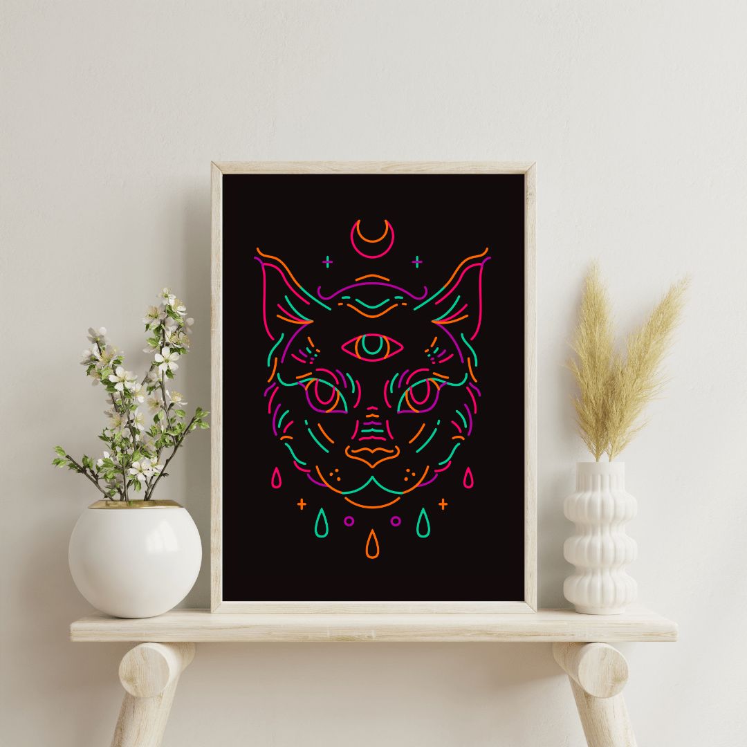 Cuadro de gatos que presenta un gato psicodélico que mira al frente y que tiene un tercer ojo aportando un toque místico a tus espacios, perfecto para la decoración del hogar u oficina.