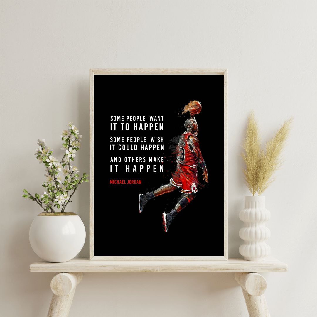 Cuadro motivacional con una frase inspiradora de Michael Jordan para que hagas que las cosas pasen, perfecto para la decoración del hogar u oficina.