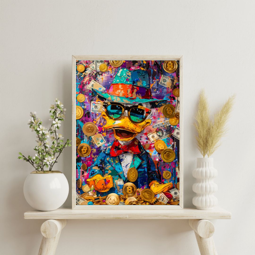 Cuadro con estilo Pop Art que presenta a un pato millonario y con mucho estilo, perfecto para la decoración del hogar u oficina.